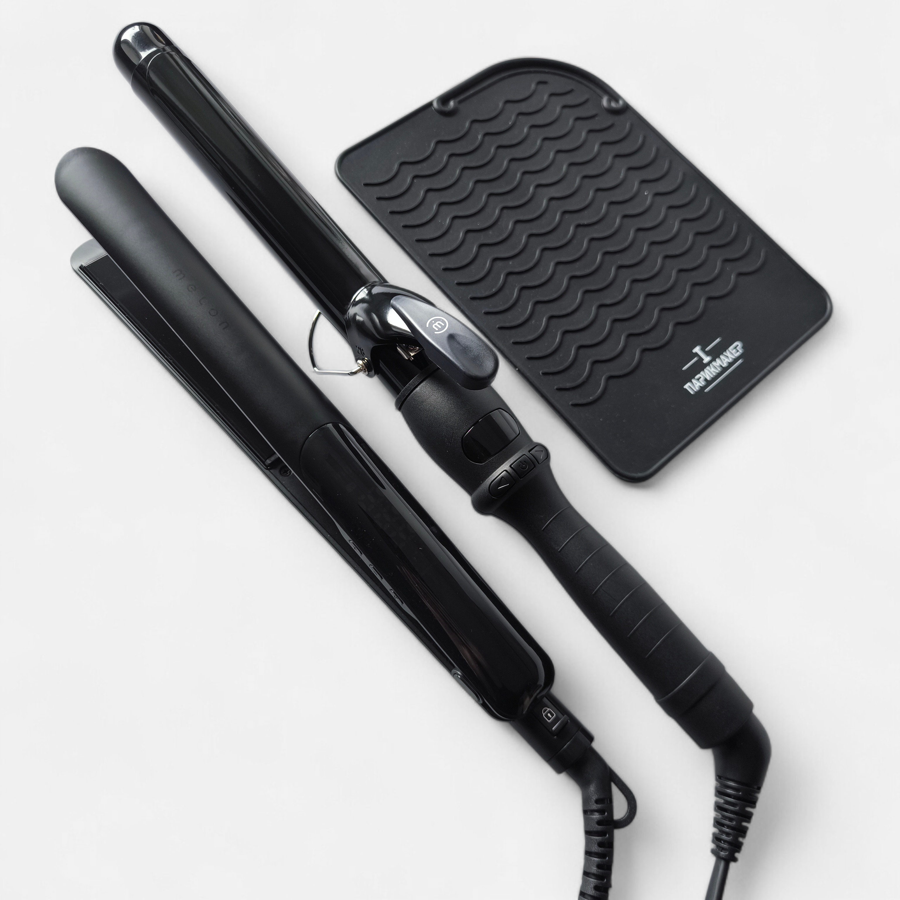 Идеальный набор для укладки волос и для создания причесок. В набор входят профессиональные качественные утюжок и плойка с самым бережным покрытием, подойдут даже для детских волос. И дополнительно термоковрик силиконовый для безопасности при работе с горячими инструментами.