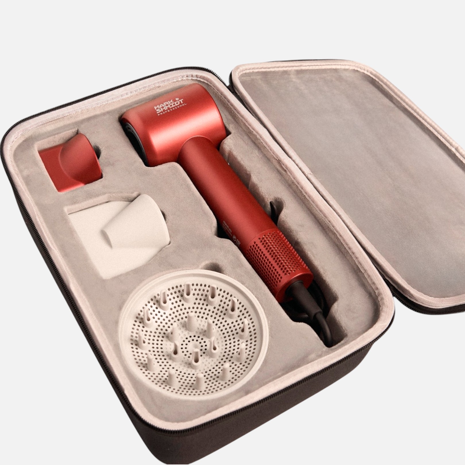 Фен поставляется в фирменном текстильном кейсе-чемоданчике с бархатной внутренней отделкой и надёжной молнией — идеально для хранения и транспортировки.
